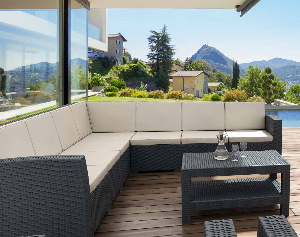 Conjunto de sala Monaco Extension Part. Fabricado en resina de polipropileno reforzada con fibra de vidrio. Efecto ratán con superficie mate. Resistente a la intemperie, protección UV contra decoloración. Apto para uso interior y exterior. Incluye configuración modular.