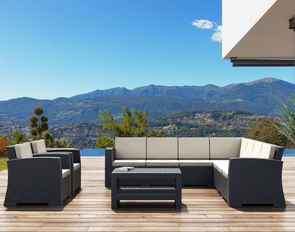Conjunto de sala Monaco Lounge Corner. Fabricado en resina de polipropileno reforzada con fibra de vidrio. Efecto ratán con superficie mate. Resistente a la intemperie, protección UV contra decoloración. Apto para uso interior y exterior. Incluye configuración modular.