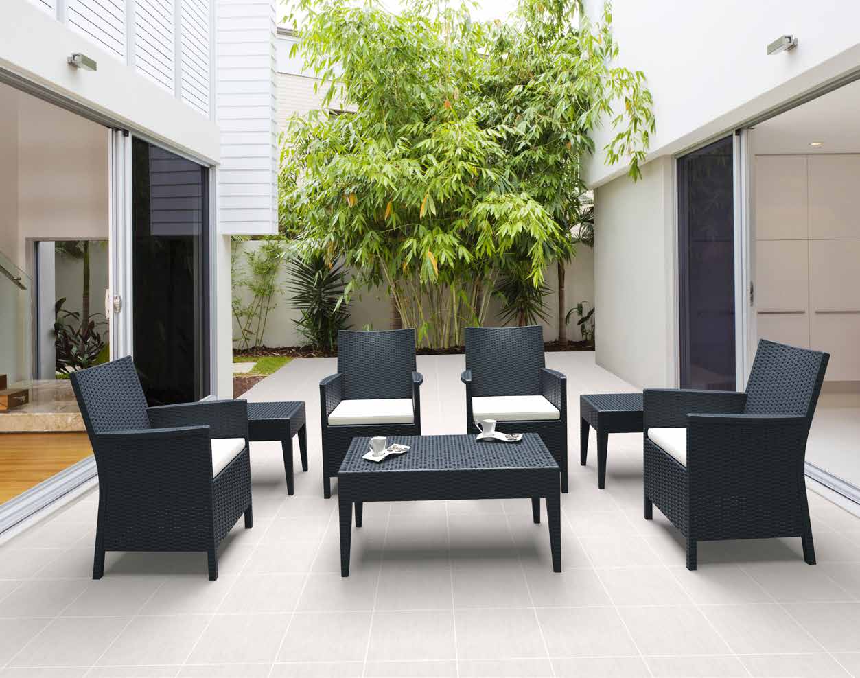 Sillón California. Fabricado en resina de polipropileno reforzada con fibra de vidrio. Efecto ratán con superficie mate. Resistente a la intemperie, protección UV contra decoloración. Apto para uso interior y exterior. Apilable, fácil de transportar y limpiar.