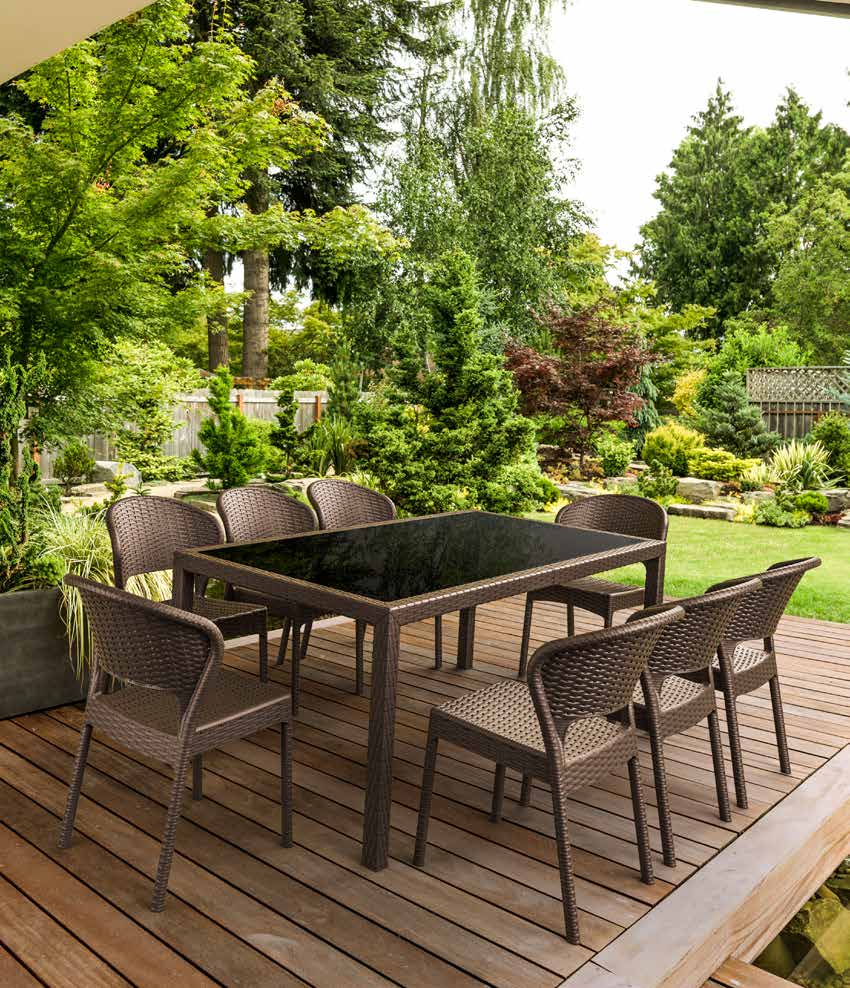 Sillón Daytona. Fabricado en resina de polipropileno reforzada con fibra de vidrio. Efecto ratán con superficie mate. Resistente a la intemperie, protección UV contra decoloración. Apto para uso interior y exterior. Apilable, fácil de transportar y limpiar.