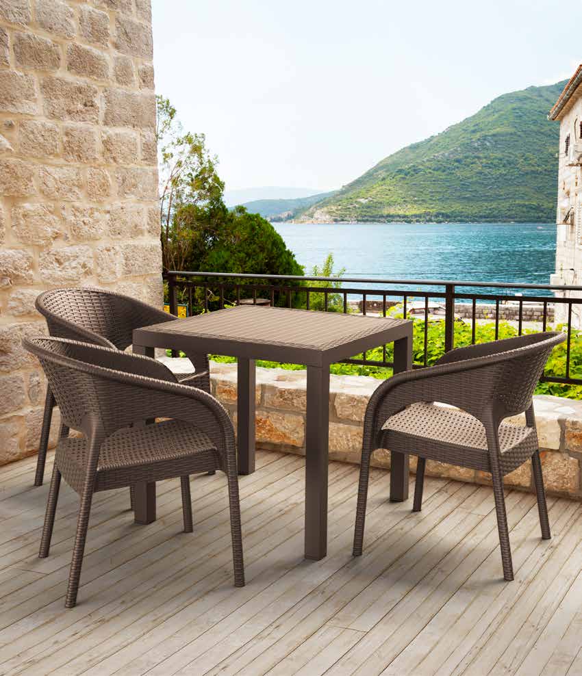 Sillón Panama. Fabricado en resina de polipropileno reforzada con fibra de vidrio. Efecto ratán con superficie mate. Resistente a la intemperie, protección UV contra decoloración. Apto para uso interior y exterior. Apilable, fácil de transportar y limpiar.